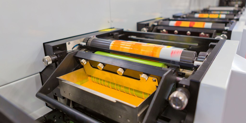 Flexographic uses plates on a traditional printing press. This is ideal for full production runs, usually 5-10M and up and high quantity printing.